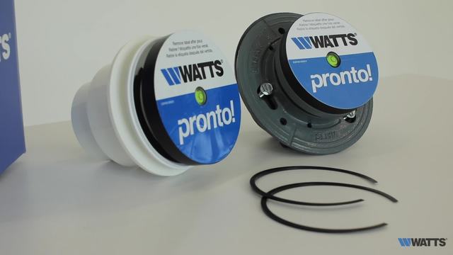 Watts Pronto! (R) FD-290-PR-60 on grade PVC floor drain with anchor flange, weepholes, post-pour adjustable round heel proof nickel bronze strainer with integrated bubble level, leveling shims, and PVC socket outlet.