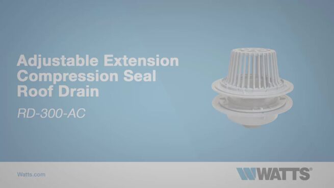 The patent-pending RD-300-AC roof drain with its highly reliable compression seal helps significantly reduce the risk of leakage and water damage, problems often experienced with other roof drains. Its creative design supports flexible height adjustment from 1" to 3-1/4". The epoxy-coated cast iron roof drain has a flashing clamp and integral gravel stop, self-locking polyethylene dome (standard), and no hub (standard) outlet.