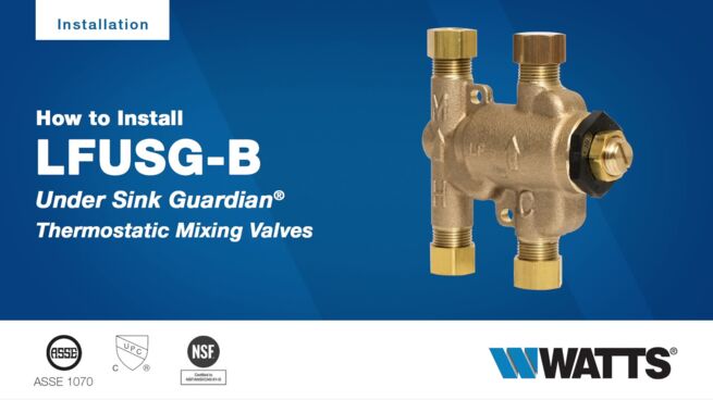 Series LFUSG-B Lead Free* Under Sink Guardian Thermostatic Mixing Valves are used in commercial and residential under-the-sink installations to maintain hot water at a desired temperature to avoid the risk of accidental scalding. It uses a thermostat to control hot and cold water temperature, and dual check valves protect against cross flow of hot water to cold and cold water to hot water piping. An integral strainer with 40 mesh screen filters out debris. Superior flow characteristics provide accurate temperature control with low pressure drop. Available with compression and push to connect fittings.
